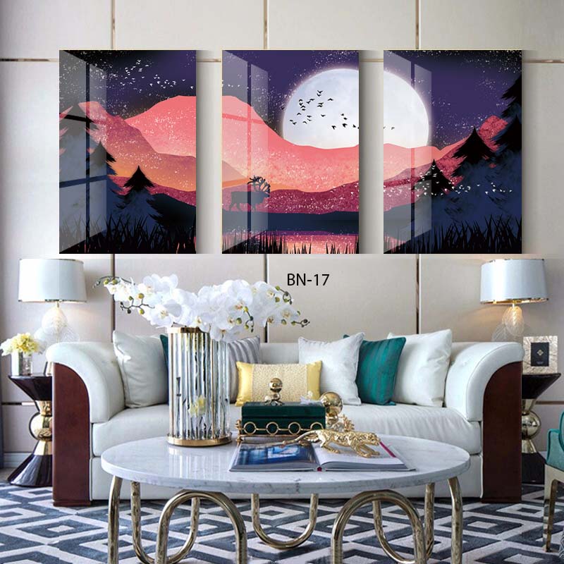 הדפסה על זכוכית מרהיבה המציגה הרים ויער בגוונים ורוד-סגול, המשלבים אווירה קסומה עם ירח מלא זוהר. בתמונה על זכוכית זו מופיעים איילים וציפורים המעופפים על רקע שמים כחול-סגול, היוצרים קומפוזיציה טבעית ומרגיעה. תמונות זכוכית לסלון מסוג triptych זו מוסיפות נופך אמנותי וייחודי לחלל, ומעניקות תחושת עומק ואלגנטיות. תמונת זכוכית איכותית זו משלבת צבעים רכים ומרגיעים, ומתאימה להדפסה על זכוכית המעניקה מראה מודרני ויוקרתי לכל סלון.