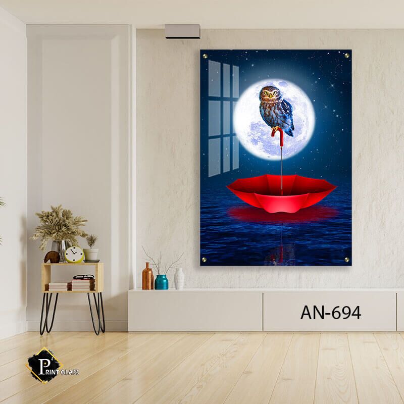 הדפסה על זכוכית מרהיבה המציגה ינשוף יושב על מטרייה אדומה, המואר באור רך של ירח מלא המרחף מעל מים כחולים. הקומפוזיציה האנכית יוצרת תחושת עומק ואווירה קסומה, המשלבת צבעים עזים של אדום וכחול עם ניגודיות טבעית. תמונה על זכוכית זו מהווה בחירה מושלמת להוספת נגיעה אמנותית וייחודית לסלון, ומדגישה את היופי שבטבע דרך תמונות זכוכית לסלון איכותיות ואלגנטיות.