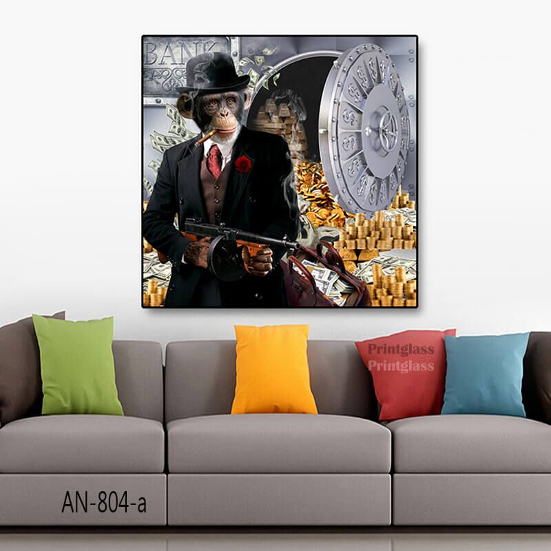 תמונת זכוכית מרובעת ומרהיבה המציגה קוף לבוש בחליפה שחורה ומגבעת, עומד מול כספת בנק פתוחה שממנה יוצאים מטבעות זהב ושטרות. ההדפסה על זכוכית מדגישה את הפרטים העשירים והצבעים העזים, ויוצרת אווירה ייחודית ומקורית. תמונות זכוכית אלו מתאימות במיוחד לסלון, ומוסיפות נגיעה של אומנות מודרנית ואלגנטית לכל חלל. תמונה על זכוכית זו משלבת קומפוזיציה חזקה עם ניגודים צבעוניים, ומדגישה את הייחודיות של תמונת זכוכית לסלון.