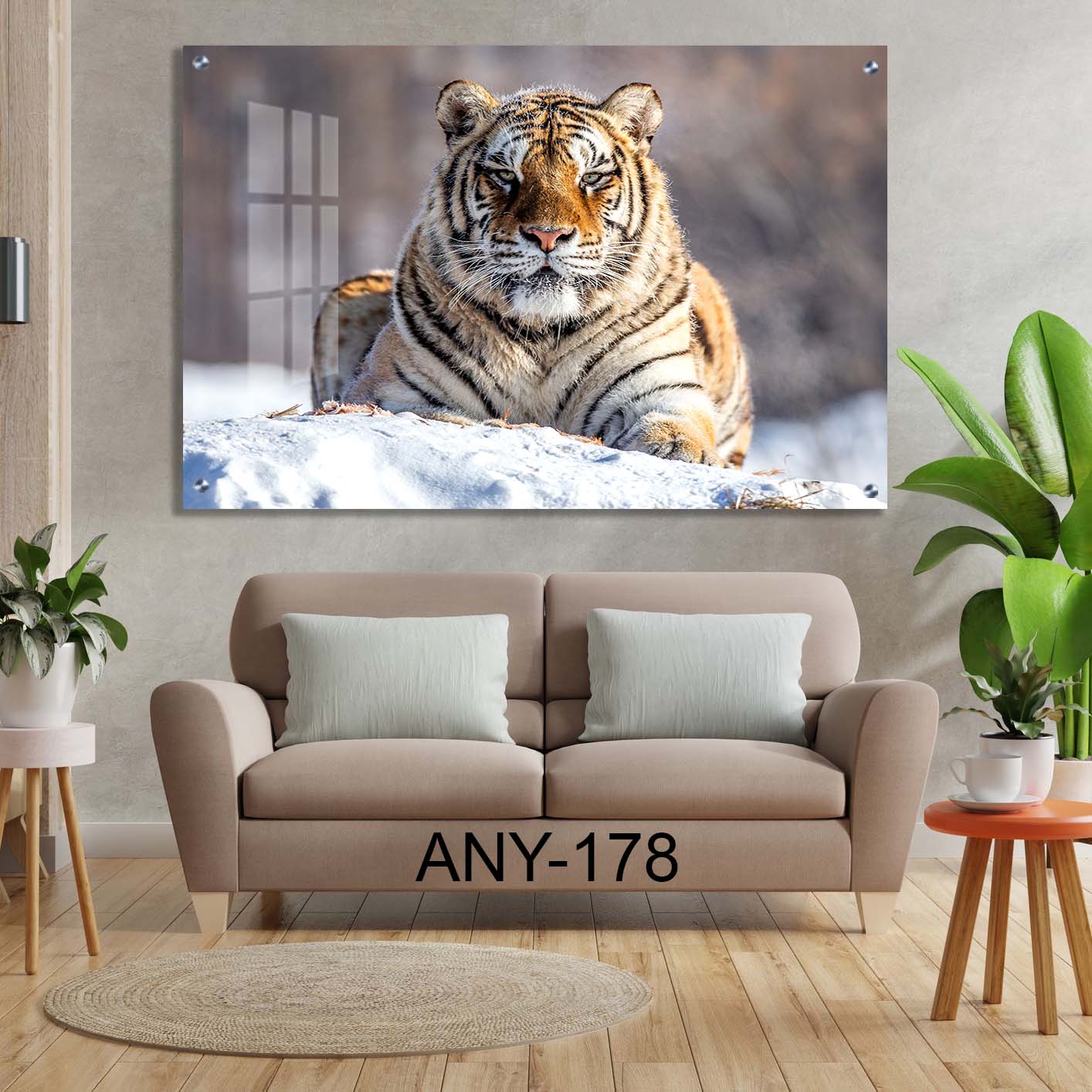 תמונת זכוכית מרהיבה המציגה נמר כתום-שחור שוכב על שלג ומביט קדימה, בשילוב צבעים עזים וקונטרסטים מרשימים. ההדפסה על זכוכית מדגישה את הפרטים העדינים של הפרווה והשלג, ויוצרת אווירה דרמטית ואלגנטית. תמונות זכוכית אלו מתאימות במיוחד לעיצוב סלון מודרני, ומוסיפות נגיעה של טבע וחיות לחלל. תמונה על זכוכית זו משלבת איכות ויופי, ומעניקה תחושת עומק וחדות יוצאת דופן. תמונת זכוכית זו היא בחירה מושלמת למי שמחפש להכניס אלמנט טבעי וייחודי לעיצוב הבית.