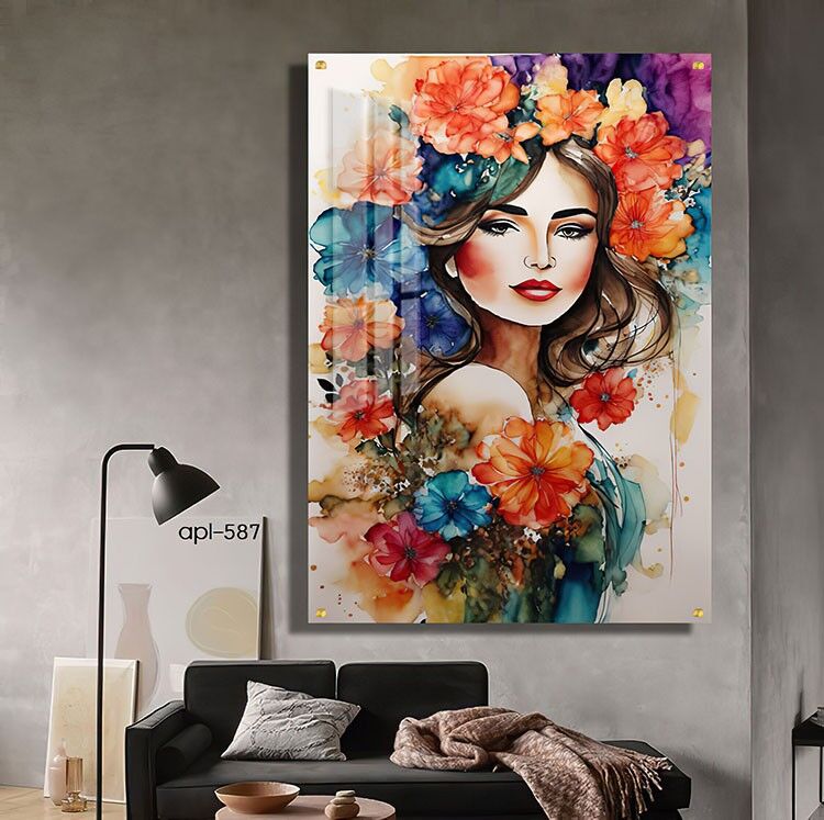 תמונת זכוכית מרהיבה המציגה פורטרט של אישה בצבעי מים עדינים, המשלבים זר פרחים צבעוניים בגוונים כתום, סגול וכחול. ההדפסה על זכוכית יוצרת מראה זוהר ועמוק, המדגיש את הפרטים הרכים והגוונים המגוונים של היצירה. תמונה על זכוכית זו מוסיפה נגיעה של אמנות ואלגנטיות לכל סלון, ומשלבת בצורה מושלמת בין צבעוניות חיה לסגנון עדין. תמונות זכוכית לסלון מסוג זה הן בחירה אידיאלית למי שמחפש להוסיף אווירה נעימה וייחודית לחלל המגורים.