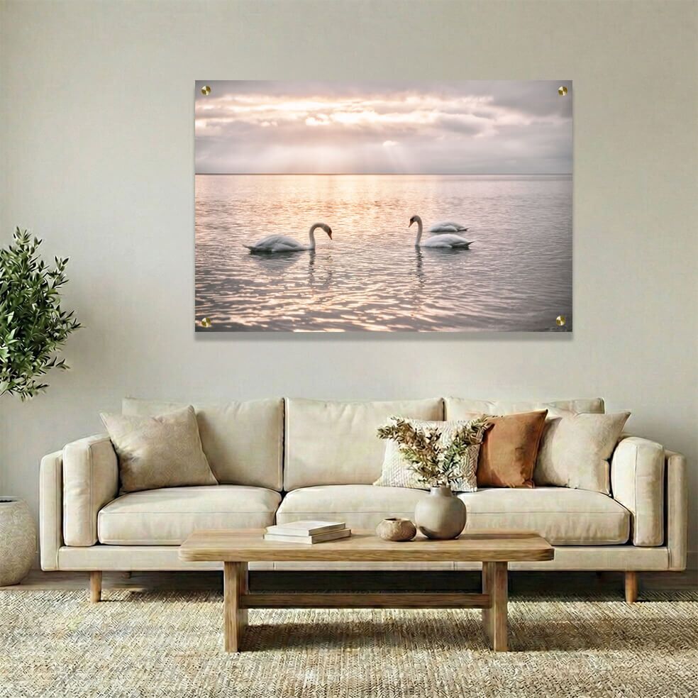 תמונת זכוכית מרהיבה המציגה זוג ברבורים לבנים השוחים על ים שקט, עם השתקפות זהובה המוסיפה עומק וחמימות לתמונה. השמים הערפליים של שחר יוצרים אווירה שלווה ומסתורית, המשלבת צבעים רכים וקומפוזיציה מאוזנת. הדפסה על זכוכית זו מדגישה את הפרטים והגוונים העדינים, ומביאה לידי ביטוי את היופי הטבעי של הסצנה. תמונות זכוכית אלו מתאימות במיוחד לעיצוב סלון, ומוסיפות נגיעה של רוגע ואלגנטיות לכל חלל. תמונה על זכוכית זו היא בחירה מושלמת למי שמחפש לשלב אמנות טבעית עם עיצוב מודרני, ומעניקה תחושת עומק ויוקרה באמצעות טכניקת ההדפסה המתקדמת.