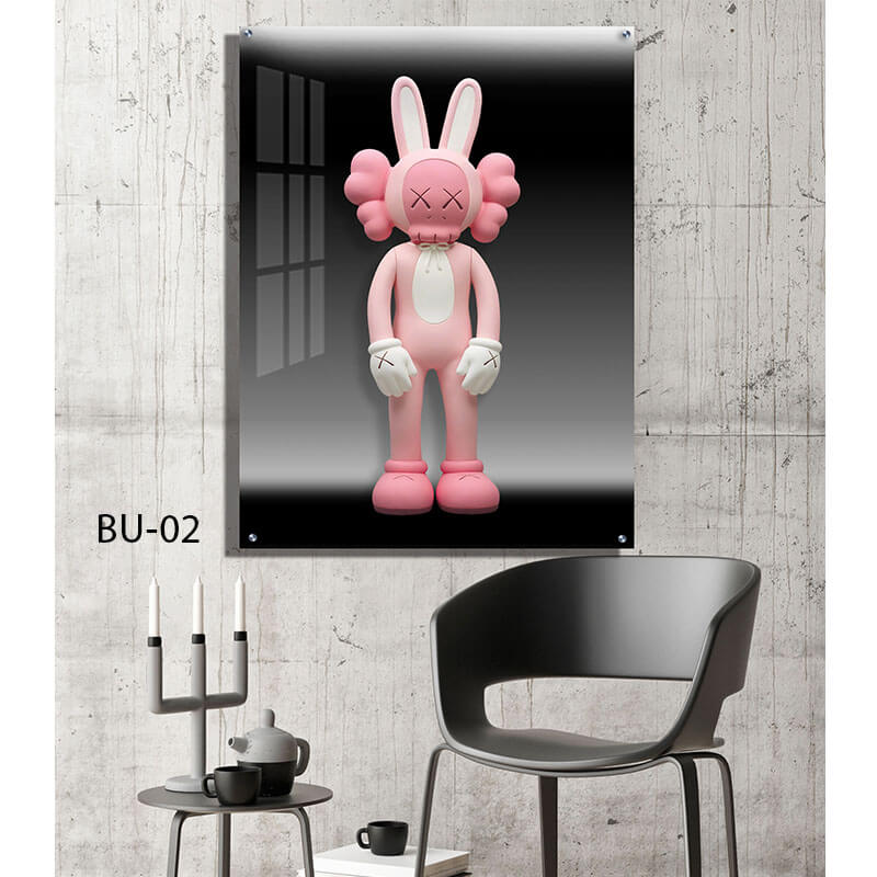 תמונת זכוכית מרהיבה המציגה בובת KAWS ורודה בדמות ארנב עם אוזניים ארוכות ועיניים צולבות, המונחת על רקע אפור-שחור אלגנטי. ההדפסה על זכוכית מדגישה את הצבע הוורוד הבוהק של הבובה, היוצר ניגודיות חזקה ומושכת את העין. הקומפוזיציה האנכית (portrait) מאפשרת להתרכז בפרטים הייחודיים של הדמות, ומעניקה תחושה מודרנית וטרנדית לחלל. תמונות זכוכית אלו מתאימות במיוחד כקישוט עיצובי ייחודי, ומוסיפות נגיעה של אמנות עכשווית לסלון. תמונה על זכוכית זו משלבת בין סגנון פופ ארט לבין עיצוב מינימליסטי, ומציעה פתרון דקורטיבי איכותי ועמיד לאורך זמן.